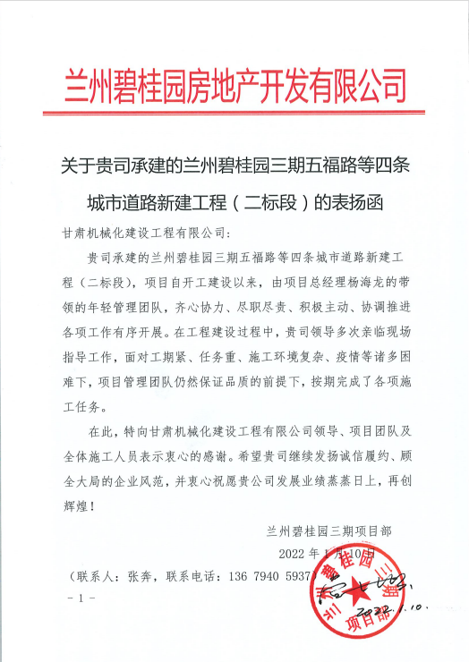 1月10日,我公司收到來自蘭州碧桂園房地產(chǎn)開發(fā)有限公司的表?yè)P(yáng)函,函中提到,蘭州碧桂園三期五福路等四條城市道路新建工程(二標(biāo)段)項(xiàng)目自開工建設(shè)以來,項(xiàng)目人員面對(duì)工期緊、任務(wù)重、施工環(huán)境復(fù)雜、疫情等諸多困難,在保證品質(zhì)的前提下,按期完成了各項(xiàng)施工任務(wù),提出表?yè)P(yáng)。