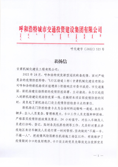 2022年12月7日,呼和浩特市交通投資建設(shè)集團(tuán)有限公司給我司發(fā)來表揚(yáng)信,表揚(yáng)信中充分肯定了我司呼和浩特新機(jī)場項目部在疫情防控工作上作出的努力,展現(xiàn)了我司的社會責(zé)任與擔(dān)當(dāng)。