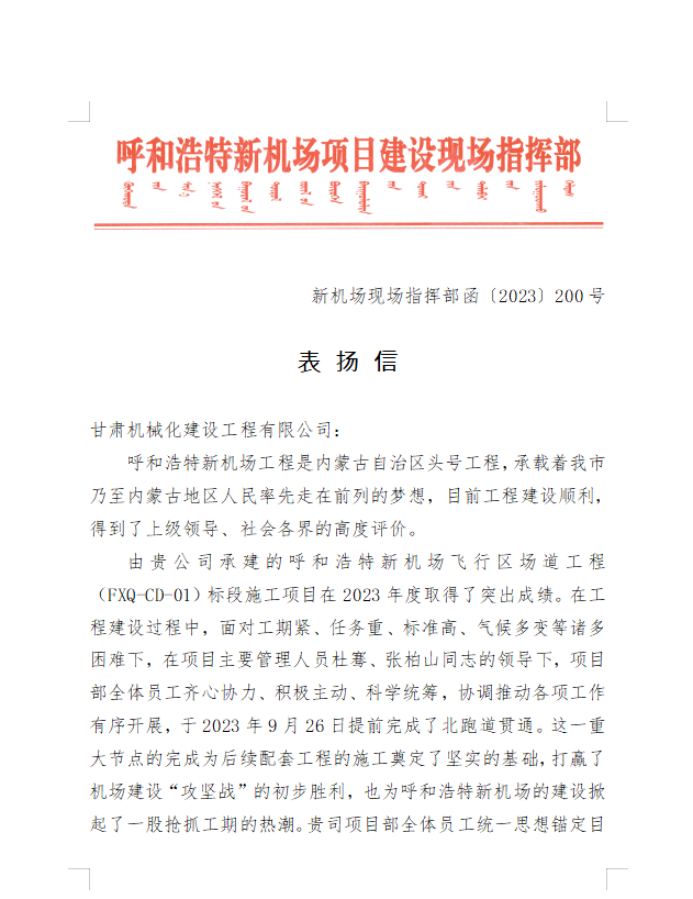 2023年9月28日,呼和浩特新機場項目建設(shè)現(xiàn)場指揮部給我司發(fā)來表揚信,信中充分肯定了我司在呼和浩特新機場項目建設(shè)中項目部全體員工統(tǒng)一思想錨定目標(biāo)、精心組織管理、發(fā)揚艱苦奮斗、迎難而上、攻堅克難的鐵軍精神,合理調(diào)配資源、強化安全質(zhì)量管理,圓滿完成了指揮部下達的各項施工任務(wù)。