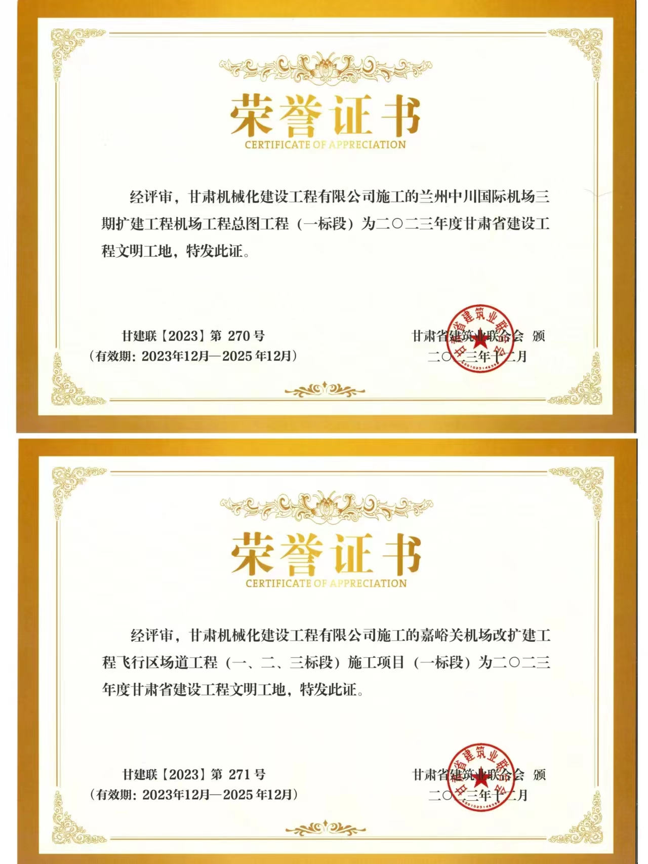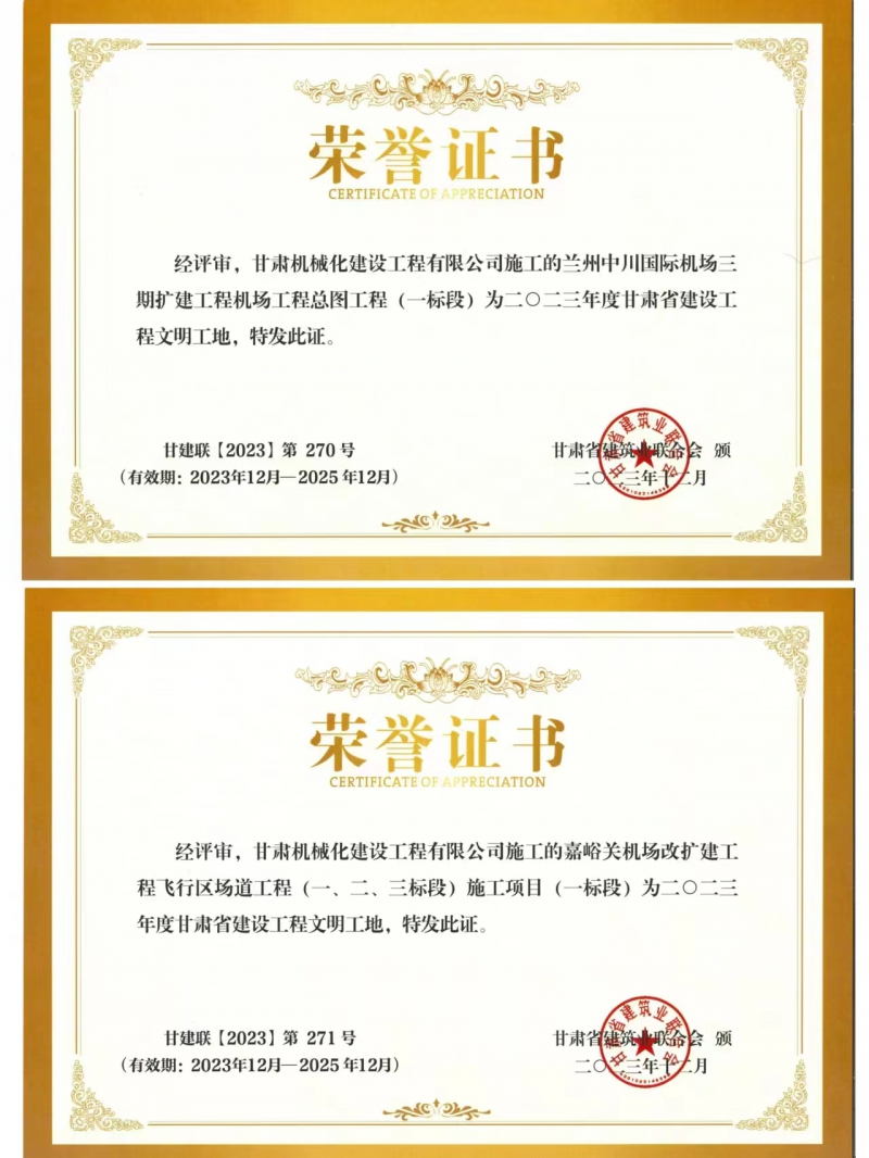近日,我司承建的蘭州中川國際機(jī)場(chǎng)二期擴(kuò)建工程機(jī)場(chǎng)工程總圖工程 (一標(biāo)段)與嘉峪關(guān)機(jī)場(chǎng)改擴(kuò)建工飛行區(qū)場(chǎng)道(一、二、三標(biāo)段) 施工項(xiàng)目 (一標(biāo)段) 獲得2023年度甘肅省建設(shè)工程文明工地榮譽(yù)稱號(hào)。